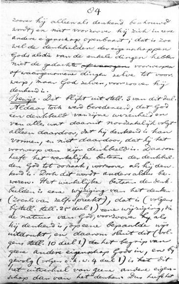 zoover hij alleen als denkend beschouwd wordt, en niet voor zoover hij zich in eene andere eigenschap openbaart; dat is zoo wel de denkbeelden der eigenschappen Gods als die van de enkele dingen hebben niet de gedachte voorwerpen of waargenomen dingen zelve tot voorwerp, maar God zelven, voor zoo ver hij denkend is. Bewijs. Dit blijkt uit stell. 3 van dit deel. Aldaar toch werd beredeneerd, dat God een denkbeeld van zijne wezenheid en van alles wat daaruit noodzakelijk volgt alleen daardoor, dat hij denkend is kan vormen, en niet daardoor, dat hij het voorwerp van zijn denkbeeld is. Daarom heeft het werkelijke bestaan der denkbeelden God tot oorzaak, voorzoover als hij denkend is. Doch dit wordt anders aldus bewezen. Het werkelijke bestaan der denkbeelden is eene wijziging van het denken (zooals van zelfs spreekt), dat is (volgens bijstell. stell. 25 deel 1.) eene wijziging, die de natuur van God, voor zoover als hij denkend is, op eene bepaalde wijs uitdrukt, en daarom sluit dit (volgens stell. 10 deel 1.) het begrip van geene andere eigenschap Gods in, en bij gevolg (volgens o.k.w. 4 deel 1.) is dit het uitwerksel van geene andere eigenschap dan van het denken. Dus heeft het >> aantal woorden: 202 |