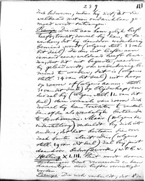 zich bedroeven, indien hij ziet, dat die weldaad met een ondankbaar gemoed wordt ontvangen. Bewijs. Die iets aan hem gelijk liefheeft, tracht, zoveel hij kan, te bewerken, dat hij daarvoor wederkerig bemind wordt (volgens stell. 33 van dit deel). Die dus uit liefde aan iemand eene weldaad heeft bewezen, doet dit uit begeerte, waardoor hij geleid wordt, om wederkerig bemind te worden, dat is (volgens stell. 34 van dit deel) uit hoop op roem of (volgens aanm. stell. 30 van dit deel) op blijdschap; en dus zal hij (volgens stell. 12 van dit deel) deze oorzaak van roem zich zooveel hij kan trachten te verbeelden of die als werkelijk bestaande te beschouwen. Maar (volgens de onderstelling) verbeeldt hij zich iets anders, dat het bestaan dien oorzaak buiten sluit. Dus (volgens stell. 19 van dit deel) zal hij juist daardoor bedroefd worden; w.t.b.w. Stelling XLIII. Haat wordt door wederkeerigen haat vermeerderd en kan daarentegen door liefde vernietigd worden. Bewijs. Die zich verbeeldt, dat de- >> aantal woorden: 164 |