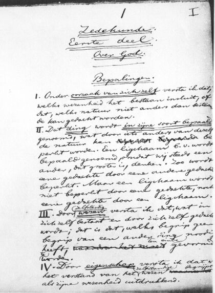 I. Onder oorzaak van zichzelf versta ik dat, welks wezenheid het bestaan insluit, of dat, welks natuur niet anders dan bestaande kan gedacht worden.
