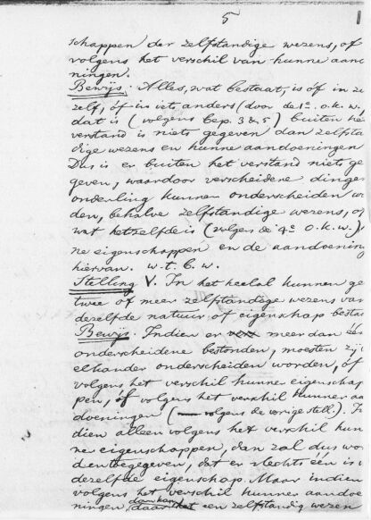 Bewijs. Indien er meer dan één onderscheidene bestonden, moesten zij van elkander onderscheiden worden, óf volgens het verschil hunner eigenschappen, óf volgens het verschil hunner aandoeningen (volgens de vorige stell.). Indien alleen volgens het verschil hunner eigenschappen, dan zal dus worden toegegeven, dat er slechts één is van dezelfde eigenschap. Maar indien volgens het verschil hunner aandoeningen, dan kan, daar een zelfstandig wezen >>