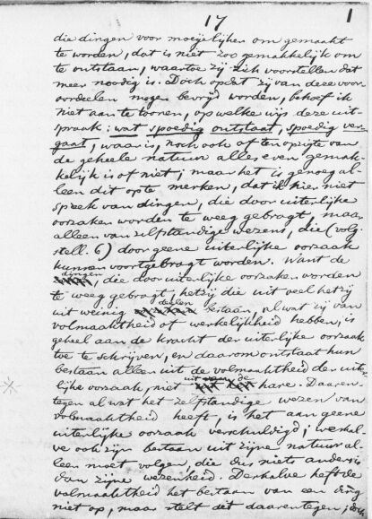 die dingen voor moeijelijker om gemaakt te worden, dat is niet zoo gemakkelijk om te onstaan, waartoe zij zich voorstellen dat meer noodig is. Doch opdat zij van deze vooroordeelen mogen bevrijd worden, behoef ik niet aan te toonen, op welke wijs deze uitspraak: wat spoedig ontstaat, spoedig vergaat, waar is, noch ook of ten opzigte van de geheele natuur alles even gemakkelijk is of niet; maar het is genoeg alleen dit op te merken, dat ik hier niet spreek van dingen, die door uiterlijke oorzaken worden te weeg gebragt, maar alleen van zelfstandige wezens, die (volg. stell. 6) door geene uiterlijke oorzaak kunnen voortgebragt worden. Want de dingen, die door uiterlijke oorzaken worden te weeg gebragt, hetzij die uit veel hetzij uit weinig deelen bestaan, al wat zij van volmaaktheid of werkelijkheid hebben, is geheel aan de kracht der uiterlijke oorzaak toe te schrijven, en daarom ontstaat hun bestaan alleen uit de volmaaktheid der uiterlijke oorzaak, niet uit de hare.°) Daarentegen al wat het zelfstandige wezen van volmaaktheid heeft, is het aan geene uiterlijke oorzaak verschuldigd; weshalve ook zijn bestaan uit zijne natuur alleen moet volgen, die dus niets anders is dan zijne wezenheid. Derhalve heft de volmaaktheid het bestaan van een ding niet op, maar stelt dit daarentegen; doch >> Annotaties: |