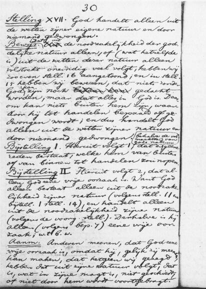 Stelling XVII. God handelt alleen uit de wetten zijner eigene natuur en door niemand gedwongen. Bewijs. Dat uit de noodzakelijkheid der goddelijke natuur alleen, of (wat hetzelfde is) uit de wetten dezer natuur alleen volstrekt oneindig veel volgt, hebben wij zoo even stell. 16 aangetoond; en in stell. 15 hebben wij bewezen, dat niets zonder God kan zijn noch gedacht worden, maar dat alles in God is. Daarom kan niets buiten hem zijn, waardoor hij tot handelen bepaald of gedwongen wordt; en dus handelt God alleen uit de wetten zijner natuur en door niemand gedwongen.°) Bijstelling I. Hieruit volgt 1, dat er behalve de volmaaktheid van Gods natuur geene reden bestaat, welke hem van buiten of van binnen tot handelen zou nopen. Bijstelling II. Hieruit volgt 2 dat alleen God eene vrije oorzaak is. Want God alleen bestaat alleen uit de noodzakelijkheid zijner natuur (volgens stell. 11 en bijstelling 1 stell. 14), en handelt alleen uit de noodzakelijkheid zijner natuur (volgens de voorg. stell.). Derhalve is hij alleen (volgens bep. 7) eene vrije oorzaak; w.t.b.w. Aanm. Anderen meenen, dat God eene vrije oorzaak is, omdat hij, gelijk zij meenen, kan maken, dat hetgeen wij gezegd hebben dat uit zijne natuur volgt, dat is, wat in zijne magt is, niet geschiedt, of niet door hem wordt voortgebragt. Annotaties: |