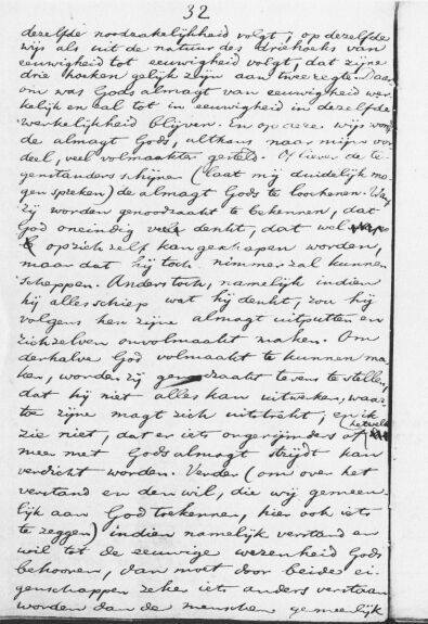 dezelfde noodzakelijkheid volgt; op dezelfde wijs als uit de natuur des driehoeks van eeuwigheid tot eeuwigheid volgt, dat zijne drie hoeken gelijk zijn aan twee regte. Daarom was Gods almagt van eeuwigheid werkelijk en zal tot in eeuwigheid in dezelfde werkelijkheid blijven. En op deze wijs wordt de almagt Gods, althans naar mijn oordeel, veel volmaakter gesteld. Of liever de tegenstanders schijnen (laat mij duidelijk mogen spreken) de almagt Gods te loochenen. Want zij worden genoodzaakt te bekennen, dat God oneindig veel denkt, dat wel op zich zelf kan geschapen worden, maar dat hij toch nimmer zal kunnen scheppen. Anders toch, namelijk indien hij alles schiep wat hij denkt, zou hij volgens hen zijne almagt uitputten en zichzelven onvolmaakt maken. Om derhalve God volmaakt te kunnen maken, worden zij genoodzaakt tevens te stellen, dat hij niet alles kan uitwerken, waartoe zijne magt zich uitstrekt, en ik zie niet, dat er iets ongerijmders of hetwelk meer met Gods almagt strijdt kan verdicht worden. Verder (om over het verstand en den wil, die wij gemeenlijk aan God toekennen, hier ook iets te zeggen) indien namelijk verstand en wil tot de eeuwige wezenheid Gods behooren, dan moet door beide eigenschappen zeker iets anders verstaan worden dan de menschen gemeenlijk >> aantal woorden: 207 |