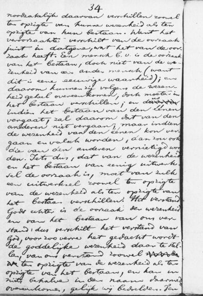 noodzakelijk daarvan verschillen zoowel ten opzigte van hunne wezenheid als ten opzigte van hun bestaan. Want het veroorzaakte verschilt van de oorzaak juist in datgene, wat het van de oorzaak heeft. Een mensch b.v. is de oorzaak van het bestaan, doch niet van de wezenheid van een ander mensch (want dit is eene eeuwige waarheid); en daarom kunnen zij volgens de wezenheid geheel overeenkomen, doch moeten in het bestaan verschillen; en dus indien het bestaan van den éénen vergaat, zal daarom dat van den anderen niet vergaan; maar indien de wezenheid van den éénen kon vergaan en valsch worden, dan zou ook die van den anderen vernietigd worden. Iets dus, dat van de wezenheid en het bestaan van eenig uitwerksel de oorzaak is, moet van zulk een uitwerksel zoowel ten opzigte van de wezenheid als ten opzigte van het bestaan verschillen. Het verstand Gods echter is de oorzaak der wezenheid en van het bestaan van ons verstand: dus verschilt het verstand van God, voor zoo verre het gedacht wordt de goddelijke wezenheid daar te stellen, van ons verstand zoowel ten opzigte van de wezenheid als ten opzigte van het bestaan, en kan in niets behalve in den naam daarmede overeenkomen, gelijk wij bedoelden. Ten >> aantal woorden: 205 |