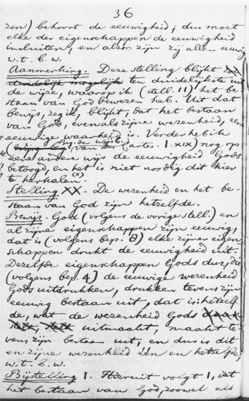zen) behoort de eeuwigheid; dus moet elke der eigenschappen de eeuwigheid insluiten, en alzoo zijn zij allen eeuwig; w.t.b.w. Aanmerking. Deze stelling blijkt ten duidelijkste uit de wijze, waarop ik (stell. 11) het bestaan van God bewezen heb. Uit dat bewijs, zeg ik, blijkt, dat het bestaan van God, evenals zijne wezenheid, eene eeuwige waarheid is. Verder heb ik (Beg. der Wijsb. van Des Cartes. I. XIX) nog op eene andere wijs de eeuwigheid God betoogd, en het is niet noodig dit hier te herhalen. (*) Stelling XX. De wezenheid en het bestaan van God zijn hetzelfde. Bewijs. God (volgens de vorige stell.) en al zijne eigenschappen zijn eeuwig, dat is (volgens bep. 8) elke zijner eigenschappen drukt de eeuwigheid uit. Dezelfde eigenschappen Gods dus, die (volgens bep. 4) de eeuwige wezenheid Gods uitdrukken, drukken tevens zijn eeuwig bestaan uit, dat is: hetzelfde wat de wezenheid Gods uitmaakt, maakt tevens zijn bestaan uit; en dus is dit en zijne wezenheid één en hetzelfde; w.t.b.w. Bijstelling I. Hieruit volgt 1, dat het bestaan van God, zoowel als >> (*) Aldaar wordt betoogd, dat het met Gods volmaaktheid strijden zou, wanneer hij eindig was.°) Annotaties: |