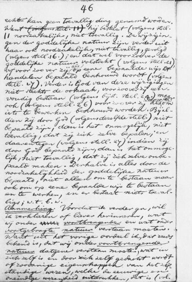 echter kan geen toevallig ding genoemd worden. Want hij bestaat (volgens stell. 11 noodzakelijk, niet toevallig. De wijzigingen der goddelijke natuur zijn verder uit haar ook noodzakelijk, niet toevallig, gevolgd (volgens stell. 16.); en dat wel voor zoo ver de goddelijke natuur volstrekt (volgens stell. 21) of voor zoo ver zij als op eene bepaalde wijs tot handelen bepaald beschouwd wordt (volgens stell. 27). Verder is God van deze wijzigingen niet slechts de oorzaak, voor zoo ver zij eenvoudig bestaan (volgens bijst. stell. 24.) maar ook (volgens stell. 26) voor zoo ver zij als bepaald om iets te bewerken beschouwd worden. Bijaldien zij door God (volgens dezelfde stell.) niet bepaald zijn, dan is het onmogelijk, niet toevallig, dat zij zich zelve bepalen; en daarentegen (volgens stell. 27) indien zij door God bepaald zijn, dan is het onmogelijk, niet toevallig, dat zij zich zelve onbepaald maken. Derhalve is alles door de noodzakelijkheid der goddelijke natuur bepaald, niet alleen om te bestaan maar ook om op eene bepaalde wijs te bestaan en te werken, en er bestaat niets toevalligs; w.t.b.w. Aanmerking. Voordat ik verder ga, wil ik verklaren of liever herinneren, wat wij onder voortbrengende en wat onder voortgebragte natuur verstaan moeten. Want uit het vorige oordeel ik, dit reeds bekend is, dat wij onder voortbrengende natuur datgene verstaan moeten, wat in zichzelf is en door zichzelf gedacht wordt of zoodanige eigenschappen van het zelfstandige wezen, welke de eeuwige en oneindige wezenheid uitdrukken, dat is (vol- >> aantal woorden: 245 |