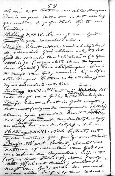 als van het bestaan van alle dingen. Dus is er geene reden om in het weerleggen van deze ongerijmdheid tijd te verbruiken. Stelling XXXIV. De magt van God is zijne wezenheid zelve. Bewijs. Want uit de noodzakelijkheid der wezenheid Gods alleen volgt, dat God de oorzaak van zichzelven is (volgens stell. 11) en (volgens stell. 16 en hare bijstell.) van alle dingen. Dus is de magt van God, waardoor hij zelf en alle dingen bestaan en werken, juist zijne wezenheid. w.t.b.w. Stelling. XXXV. Al wat wij inzien dat in de magt van God is, bestaat noodzakelijk. Bewijs. Want al wat in Gods magt is, dat moet (volgens de voorgaande stelling) alzoo in zijne wezenheid bevat wezen, dat het daaruit noodzakelijk volgt, en dus bestaat het noodzakelijk; w.t.b.w. Stelling XXXVI. Niets bestaat, uit welks natuur geen gevolg voortvloeit. Bewijs. Al wat bestaat, drukt de natuur of wezenheid van God op eene zekere en bepaalde wijs uit (volgens bijst. stell. 25), dat is (volgens stell. 34) al wat bestaat, drukt de magt van God, welke de oorzaak is van alle dingen, op een zekere >> aantal woorden: 183 |