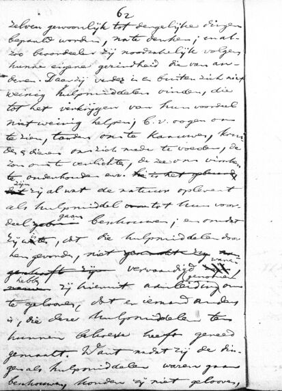zelven gewoonlijk tot dergelijke dingen bepaald worden, na te denken; en alzoo beoordeelen zij noodzakelijk volgens hunne eigene gezindheid die van anderen. Daar zij verder in en buiten zich niet weinig hulpmiddelen vinden, die tot het verkrijgen van hun voordeel niet weinig helpen; b.v. oogen om te zien, tanden om te kaauwen, kruiden en dieren om zich mede te voeden, de zon om te verlichten, de zee om visschen te onderhouden enz. zijn zij al wat de natuur oplevert als hulpmiddel tot hun voordeel gaan beschouwen; en omdat zij wisten, dat die hulpmiddelen door hen gevonden, niet vervaardigd waren, hebben zij hieruit aanleiding genomen om te gelooven, dat er iemand anders is, die deze hulpmiddelen ten hunnen behoeve heeft gereed gemaakt. Want nadat zij de dingen als hulpmiddelen waren gaan beschouwen, konden zij niet gelooven, >> aantal woorden: 136 |