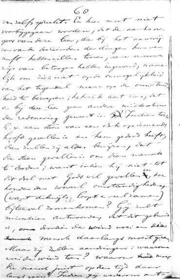 vanzelfs spreekt. En hier moet niet voorbijgegaan worden, dat de aanhangers van deze leer, die bij het aanwijzen van de doeleinden der dingen hun vernuft hebben willen toonen, eene nieuwe wijs van betoogen hebben ingevoerd, namelijk om zich niet op de onmogelijkheid van het tegendeel maar op de onwetendheid te beroepen; hetwelk doet zien, dat er bij deze leer geen andere middenterm der redenering geweest is. Indien toch b.v.een steen van een dak op iemands hoofd gevallen is en hem gedood heeft, dan zullen zij aldus bewijzen, dat die steen gevallen is om dien mensch te dooden; want indien hij niet tot dit doel met Gods wil gevallen was, hoe konden dan zooveel omstandigheden (want dikwijls loopt er veel zamen) bij toeval zamenkomen? Gij zult misschien antwoorden, dat dit gebeurd is, doordien de wind woei en die mensch daarlangs moest gaan. Maar zij zullen aandringen: waarom woei de wind toen? Waarom moest die mensch juist op dien tijd daar langs gaan? Indien gij wederom ant- >> aantal woorden: 166 |