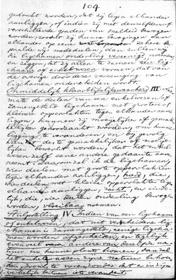 gedrukt worden, dat zij tegen elkander aanliggen, of indien zij met denzelfden of verschillende graden van snelheid bewogen worden, zoodat zij hunne bewegingen aan elkander op eene zekere bepaalde wijs mededeelen, dan zullen wij die ligchamen onderling vereenigd noemen, en zeggen, dat zij allen te zamen één ligchaam of enkelwezen vormen, dat van de overige door deze vereeniging van ligchamen onderscheiden wordt. Onmiddelijk klaarblijkelijke waarheid III. Naarmate de delen van een enkelwezen of zamengesteld ligchaam met grootere of kleinere oppervlakten tegen elkander aanliggen, kunnen zij moeijelijker of gemakkelijker genoodzaakt worden, om hunne ligging te veranderen, en bij gevolg kan des te gemakkelijker of moeijelijker bewerkt worden, dat het enkelwezen zelf eene andere gedaante aanneemt. Daarom zal ik de ligchamen, wier deelen met groote oppervlakten tegen elkander aanliggen, hard, die, wier deelen met kleine oppervlakten tegen elkander aanliggen, zacht, en eindelijk, die, wier deelen onderling bewogen worden, vloeibaar noemen. Hulpstelling IV. Indien van een ligchaam of enkelwezen, dat uit verscheidene ligchamen is zamengesteld, eenige ligchamen worden afgescheiden, en tegelijk even veel andere van dezelfde natuur in hunne plaats komen, dan zal het enkelwezen zijne natuur behouden, zooals te voren, zonder dat er in zijn werkelijk bestaan iets verandert. aantal woorden: 200 |