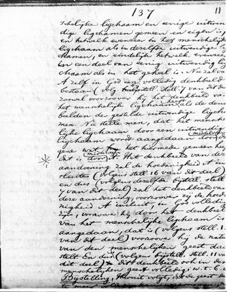 schelijke ligchaam en eenige uitwendige ligchamen gemeen en eigen is, en hetwelk evenzeer in het menschelijke ligchaam als in dezelfde uitwendige ligchamen, en eindelijk hetwelk evenzeer in een deel van eenig uitwendig ligchaam als in het geheel is. Nu zal van A zelf in God een volledig denkbeeld bestaan (volg. bijstell. stell. 7 van dit deel) zoowel voor zoover hij het denkbeeld van het menschelijk ligchaam heeft als de denkbeelden der gestelde uitwendige ligchamen. Nu stelle men, dat het menschelijke ligchaam door een uitwendig ligchaam wordt aangedaan door middel van datgene wat het hiermede gemeen heeft, dat is, door middel van A. Het denkbeeld van deze aandoening zal de hoedanigheid A insluiten (volgens stell. 16 van dit deel), en dus (volgens dezelfde bijstell. stell. 7 van dit deel) zal het denkbeeld van deze aandoening, voorzoover zij de hoedanigheid A insluit, in God volledig zijn, voorzoover hij door het denkbeeld van het menschelijke ligchaam is aangedaan, dat is (volgens stell. 1 van dit deel) voorzoover hij de natuur van de menschelijken geest daarstelt. En dus is (volgens bijstell. stell. 11 van dit deel) dit denkbeeld ook in den menschelijken geest volledig; w.t.b.w. Bijstelling. Hieruit volgt, dat de geest des te meer volledig kan waarnemen, naar- >> aantal woorden: 205 |