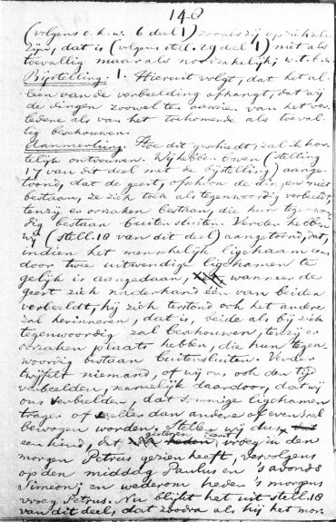 (volgens o.k.w. 6 deel 1) zooals zij op zichzelven zijn, dat is (volgens stell. 29 deel 1) niet als toevallig maar als noodzakelijk; w.t.b.w. Bijstelling 1. Hieruit volgt, dat het alleen van de verbeelding afhangt, dat wij de dingen zoowel ten aanzien van het verledene als van het toekomende als toevallig beschouwen. Aanmerking. Hoe dit geschiedt zal ik kortelijk ontvouwen. Wij hebben boven (stelling 17 van dit deel met de bijstelling) aangetoond, dat de geest, ofschoon de dingen niet bestaan, ze zich toch als tegenwoordig verbeeldt, tenzij er oorzaken bestaan, die hun tegenwoordig bestaan buiten sluiten. Verder hebben wij (stell. 18 van dit deel) aangetoond, dat, indien het menschelijk ligchaam eens door twee uitwendige ligchamen te gelijk is aangedaan, wanneer de geest zich naderhand één van beiden verbeeldt, hij zich terstond ook het andere zal herinneren, dat is, beide als bij zich tegenwoordig zal beschouwen, tenzij er oorzaken plaats hebben, die hun tegenwoordig bestaan buitensluiten. Verder twijfelt niemand, of wij ons ook den tijd verbeelden, namelijk daardoor, dat wij ons verbeelden, dat sommige ligchamen trager of sneller dan andere of even snel bewogen worden. Stellen wij dus een kind, dat gisteren eerst vroeg in den morgen Petrus gezien heeft, vervolgens op den middag Paulus en 's avonds Simeon; en wederom heden 's morgens vroeg Petrus. Nu blijkt het uit stell. 18 van dit deel, dat zoodra als hij het mor- >> aantal woorden: 231 |
