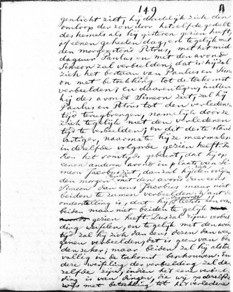 genlicht ziet, hij dadelijk zich den omloop der zon door hetzelfde gedeelte des hemels als hij gisteren gezien heeft, of eenen geheelen dag, en te gelijk met den morgenstond Petrus, met het middaguur Paulus en met den avond Simeon zal verbeelden; dat is: hij zal zich het bestaan van Paulus en Simeon met betrekking tot de toekomst verbeelden; en daarentegen, indien hij des avonds Simeon ziet, zal hij Paulus en Petrus tot den verledenen tijd terugbrengen, namelijk door ze zich tegelijk met den verledenen tijd te verbeelden; en dit des te standvastiger, naarmate hij ze meermalen in dezelfde volgorde gezien heeft. Indien het somtijds gebeurt, dat hij op eenen anderen avond in plaats van Simeon Jacobus ziet, dan zal hij zich den volgenden morgen tegelijk met den avond dan eens Simeon dan eens Jacobus maar niet beiden te zamen verbeelden. Want de onderstelling is, dat hij des avonds slechts één van beiden maar niet beiden te gelijk gezien heeft. Dus zal zijne verbeelding weifelen, en te gelijk met den avondtijd zal hij zich dan eens dezen dan weer genen verbeelden, dat is geen van beiden zeker; maar beiden zal hij als toevallig in de toekomst beschouwen. En deze weifeling der verbeelding zal dezelfde zijn, indien het eene verbeelding is van dingen, die wij op dezelfde wijs met betrekking tot het verledene >> aantal woorden: 222 |