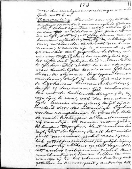 van de eeuwige en oneindige wezenheid Gods. w.t.b.w. Aanmerking. Hieruit zien wij, dat de eindige wezenheid en eeuwigheid Gods aan allen bekend zijn. Daar echter alles in God en door middel van God gedacht wordt, zoo volgt, dat wij uit deze kennis zeer veel kunnen afleiden, hetwelk wij volledig kennen, en alzoo die derde soort van kennis vormen, waarover wij in aanmerk. 2. stell. 40 van dit deel gesproken hebben, en over wier voortreffelijkheid en nuttigheid wij in het vijfde deel gelegenheid zullen hebben te spreken. Dat echter de menschen geen even duidelijke kennis van God hebben als van de algemeene begrippen komt daarvan daan, dewijl zij zich God niet evenals de ligchamen kunnen verbeelden, dewijl zij den naam God verbonden hebben met de beelden der dingen, die zij gewoon zijn te zien, wat de menschen naauwlijks kunnen vermijden, dewijl zij aanhoudend door de uitwendige ligchamen worden aangedaan. En voorzeker bestaan de meeste dwalingen alleen daarin, dat wij namelijk de namen niet goed op de dingen toepassen. Want wanneer iemand zegt, dat de lijnen, die uit het middelpunt van eenen cirkel naar zijnen omtrek getrokken worden, ongelijk zijn, verstaat hij althans op dat oogenblik iets anders onder eenen cirkel dan de meetkundigen. Evenzoo hebben de menschen wanneer zij in het rekenen dwalen, andere getallen in hunnen geest, andere op het pa- >> aantal woorden: 222 |