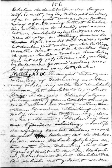 behalve de denkbeelden der dingen zelf. Er moet, zeg ik, onderzocht worden, of er in de geest eene andere toestemming of ontkenning bestaat behalve die, welke een denkbeeld, voorzoover het denkbeeld is, insluit, waarover men de volgende stelling, benevens de bep. 3. van dit deel nazie, opdat het denken niet onder prentverbeeldingen vervalle. Want met denkbeelden bedoel ik geene beelden zooals op den bodem van het oog, of, als men wil, midden in de hersenen gevormd worden, maar de begrippen van het denken. Stelling XLIX. In den geest bestaat geene wilsuiting of toestemming en ontkenning behalve die, welke het denkbeeld voorzoover het denkbeeld is, insluit. Bewijs. In den geest bestaat (volgens de vorige stell.) geen volstrekt vermogen om te willen en niet te willen, maar alleen bijzondere wilsuitingen, namelijk deze en die toestemming, deze en die ontkenning. Denken wij dus eene bijzondere wilsuiting, namelijk de wijziging van het denken, waarmee de geest toestemt, dat de drie hoeken van een driehoek gelijk zijn aan twee regte. Deze toestemming sluit het begrip of denkbeeld van den driehoek in, dat is, kan zonder het denkbeeld van den driehoek niet gedacht worden. aantal woorden: 188 |