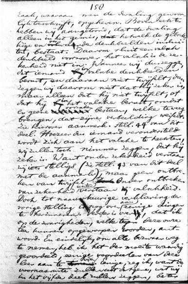 zaak, waaraan men de dwaling gewoonlijk toeschrijft, opgeheven. Boven echter hebben wij aangetoond, dat de dwaling alleen in het gemis, hetwelk de gebrekkige en verwarde denkbeelden insluiten, bestaat. Daarom sluit een valsch denkbeeld voorzoover het valsch is de zekerheid niet in. Wanneer wij dus zeggen, dat iemand in valsche denkbeelden berust, en daaraan niet twijfelt, dan zeggen wij daarom niet dat hij zeker is, maar alleen dat hij niet twijfelt, of dat hij in het valsche berust, omdat er geene oorzaken bestaan, welke te weeg brengen, dat zijne verbeelding weifelt. Zie hierover aanmerk. stell. 44 van dit deel. Hoezeer dus iemand verondersteld wordt zich aan het valsche te hechten, wij zullen toch nimmer zeggen, dat hij zeker is. Want onder zekerheid verstaan wij iets stelligs (zie stell. 43 van dit deel met de aanmerk.), maar geen ontbreken van twijfel. Onder ontbreken van zekerheid echter verstaan wij valschheid. Doch tot naauwkeurige verklaring der vorige stelling is nog over aan eenige dingen te herinneren. Verder is over, dat ik op de zwarigheden, welke tegen deze onze leer kunnen opgeworpen worden, antwoord. En eindelijk, om alle bezwaar weg te nemen, heb ik het der moeite waardig geoordeeld, eenige voordeelen van deze leer aan te wijzen. Eenige, zeg ik, want de voornaamste zullen uit datgene, wat wij in het vijfde deel zullen zeggen, beter >> aantal woorden: 221 |