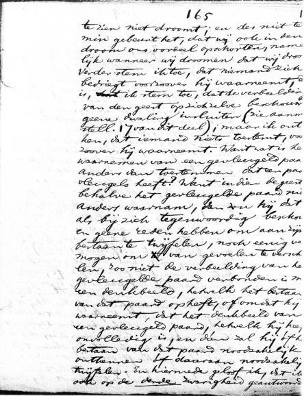 te zien niet droomt; en des niet te min gebeurt het, dat wij ook in den droom ons oordeel opschorten, namelijk wanneer wij droomen dat wij droomen. Verder stem ik toe, dat niemand zich bedriegt voorzoover hij waarneemt, dat is, ik stem toe, dat de verbeelding van den geest op zichzelve beschouwt geene dwaling insluiten (zie aanm. stell. 17 van dit deel); maar ik ontken, dat iemand niets toestemt, voorzoover hij waarneemt. Want wat is het waarnemen van een gevleugeld paard anders dan toestemmen dat een paard vleugels heeft? Want indien de geest behalve het gevleugelde paard niets anders waarnam, dan zou hij dat als bij zich tegenwoordig beschouwen en geene reden hebben om aan zijn bestaan te twijfelen, noch eenig vermogen om van gevoelen te verschillen, zoo niet de verbeelding van het gevleugelde paard verbonden is met een denkbeeld, hetwelk het bestaan van dat paard opheft, of omdat hij waarneemt, dat het denkbeeld van een gevleugeld paard, hetwelk hij heeft, onvolledig is, en dán zal hij óf het bestaan van dat paard noodzakelijk ontkennen óf daaraan noodzakelijk twijfelen. En hiermede geloof ik, dat ik ook op de derde zwarigheid geantwoord >> aantal woorden: 192 |