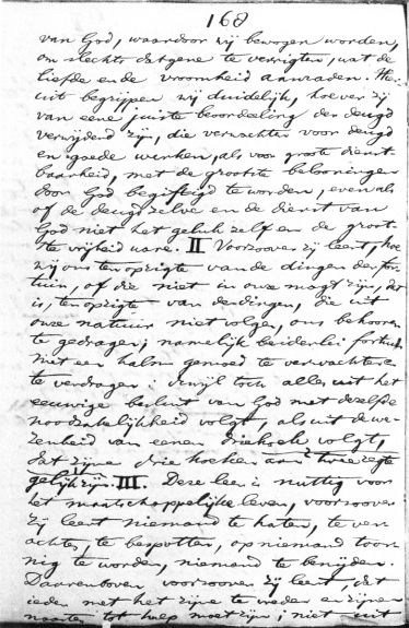 van God, waardoor wij bewogen worden, om slechts datgene te verrigten, wat de liefde en de vroomheid aanraden. Hieruit begrijpen wij duidelijk, hoever zij van eene juiste beoordeling der deugd verwijderd zijn, die verwachten voor deugd en goede werken, als voor groote dienstbaarheid, met de grootste belooningen door God begiftigd te worden, even als of de deugd zelve en de dienst van God niet het geluk zelf en de grootste vrijheid ware. II Voorzoover zij leert, hoe wij ons ten opzigte van de dingen der fortuin, of die niet in onze magt zijn, dat is, ten opzigte van de dingen, die uit onze natuur niet volgen, ons behooren te gedragen; namelijk beiderlei fortuin met een kalm gemoed te verwachten en te verdragen dewijl toch alle uit het eeuwige besluit van God met dezelfde noodzakelijkheid volgt, als uit de wezenheid van eenen driehoek volgt, dat zijne drie hoeken gelijk zijn aan twee regte. III. Deze leer is nuttig voor het maatschappelijke leven, voorzoover zij leert niemand te haten, te verachten, te bespotten, op niemand toornig te worden, niemand te benijden. Daarenboven voorzoover zij leert, dat ieder met het zijne te vreden en zijnen naasten tot hulp moet zijn; niet uit >> aantal woorden: 200 |