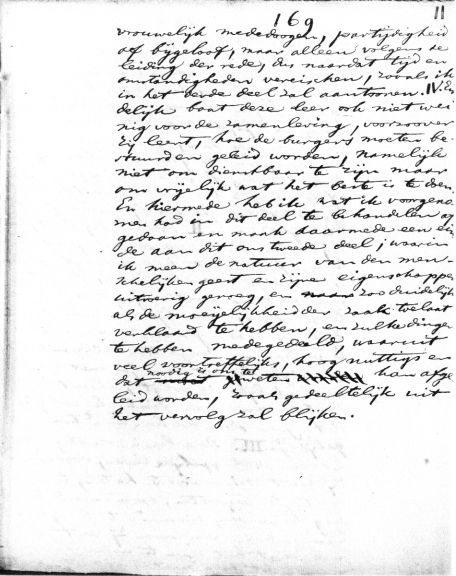 vrouwelijk mededoogen, partijdigheid of bijgeloof, maar alleen volgens de leiding der rede, dus naardat tijd en omstandigheden vereischen, zooals ik in het derde deel zal aantoonen. IV. Eindelijk baat deze leer ook niet weinig voor de zamenleving, voorzoover zij leert, hoe de burgers moeten bestuurd en geleid worden, namelijk niet om dienstbaar te zijn maar om vrijelijk wat het beste is te doen. En hiermede heb ik wat ik voorgenomen had in dit deel te behandelen afgedaan en maak daarmede een einde aan dit ons tweede deel; waarin ik meen de natuur van den menschelijken geest en zijnen eigenschappen uitvoerig genoeg, en zoo duidelijk als de moeijelijkheid der zaak toelaat, verklaart te hebben, en zulke dingen te hebben medegedeeld, waaruit veel voortreffelijks, hoog nuttigs en dat noodig is om te weten kan afgeleid worden, zooals gedeeltelijk uit het vervolg zal blijken. aantal woorden: 141 |
