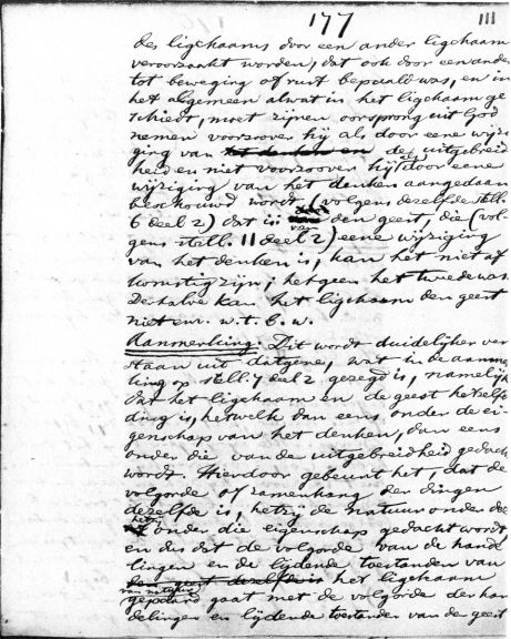 des ligchaams door een ander ligchaam veroorzaakt worden, dat ook door een ander tot beweging of rust bepaald was, en in het algemeen alwat in het ligchaam geschiedt, moet zijnen oorsprong uit God nemen voorzoover hij als door eene wijziging van de uitgebreidheid en niet voorzoover hij als door eene wijziging van het denken aangedaan beschouwd wordt (volgens dezelfde stell. 6 deel 2) dat is: van den geest, die (volgens stell. II deel 2) eene wijziging van het denken is, kan het niet afkomstig zijn; hetgeen het tweede was. Derhalve kan het ligchaam den geest niet enz. w.t.b.w. Aanmerking. Dit wordt duidelijker verstaan uit datgene, wat in de aanmerking op stell.7 deel 2 gezegd is, namelijk dat het ligchaam en de geest hetzelfde ding is, hetwelk dan eens onder de eigenschap van het denken, dan eens onder die van de uitgebreidheid gedacht wordt. Hierdoor gebeurt het, dat de volgorde of zamenhang der dingen dezelfde is, hetzij de natuur onder deze hetzij onder die eigenschap gedacht wordt en dus dat de volgorde van de handelingen en de lijdende toestanden van het ligchaam van natuur gepaard gaat met de volgorde der handelingen en lijdende toestanden van de geest >> aantal woorden: 197 |