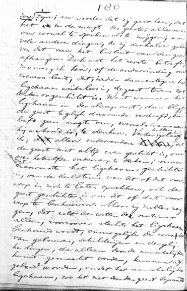 zijn zou; en verder dat zij gevoelen, dat het in de magt des geestes alleen is om zoowel te spreken als te zwijgen, en vele andere dingen, die zij derhalve geloven dat van het besluit van den geest afhangen. Doch wat het eerste betreft, zoo vraag ik hen, of de ondervinding nu evenzoo leert, dat, indien daarentegen het ligchaam werkeloos is, de geest tevens tot denken ongeschikt is. Want wanneer het ligchaam in den slaap rust, dan blijft de geest te gelijk daarmede verdoofd, en heeft geene magt om, evenals wanneer hij wakend is, te denken. Verder hebben, geloof ik, allen ondervonden, dat de geest niet altijd even geschikt is, om over hetzelfde onderwerp te denken; maar dat naarmate het ligchaam geschikter is, om de beeldtenis van dit of dat voorwerp in zich te laten opwekken, ook de geest geschikter is om dit of dat voorwerp te beschouwen. Maar zij zullen zeggen, dat uit de wetten der natuur alleen, voorzoover slechts het ligchaam beschouwd wordt, onmogelijk de oorzaken van gebouwen, schilderijen en dergelijke dingen, die alleen door de menschelijke kunst gemaakt worden, kunnen afgeleid worden, en dat het menschelijke ligchaam, zoo het niet door den geest bepaald >> aantal woorden: 198 |