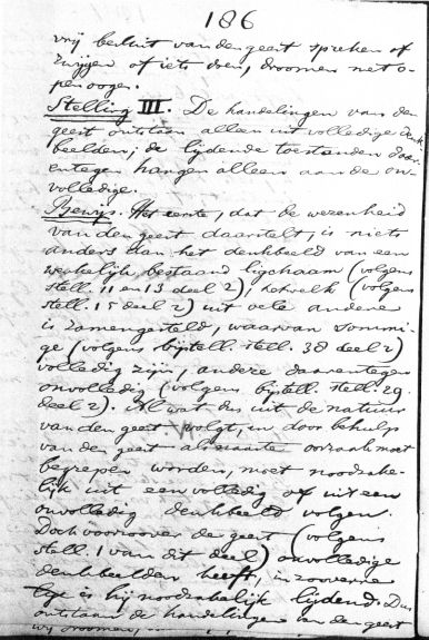 vrij besluit van den geest spreken of zwijgen of iets doen, droomen met open oogen. Stelling III. De handelingen van den geest ontstaan alleen uit volledige denkbeelden; de lijdende toestanden daarentegen hangen alleen aan de onvolledige. Bewijs. Het eerste, dat de wezenheid van den geest daarstelt, is niets anders dan het denkbeeld van een werkelijk bestaand ligchaam (volgens stell. 11 en 13 deel 2), hetwelk (volgens stell. 15 deel 2) uit vele andere is zamengesteld, waarvan sommige (volgens bijstell. stell. 38 deel 2) volledig zijn, andere daarentegen onvolledig (volgens bijstell. stell. 29. deel 2). Al wat dus uit de natuur van den geest volgt, en door behulp van den geest als naaste oorzaak moet begrepen worden, moet noodzakelijk uit een volledig of uit een onvolledig denkbeeld volgen. Doch voorzoover de geest (volgens stell. 1 van dit deel) onvolledige denkbeelden heeft, in zooverre is hij noodzakelijk lijdend. Dus ontstaan de handelingen van den geest >> aantal woorden: 154 |