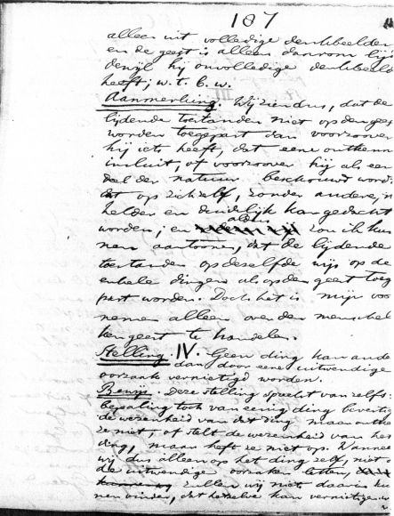 alleen uit volledige denkbeelden en de geest is alleen daarom lijdend dewijl hij onvolledige denkbeelden heeft; w.t.b.w. Aanmerking. Wij zien dus, dat de lijdende toestanden niet op den geest worden toegepast dan voorzoover hij iets heeft, dat eene ontkenning insluit, of voorzoover hij als een deel der natuur beschouwd wordt, dat op zichzelf, zonder andere, niet helder en duidelijk kan gedacht worden; en aldus zou ik kunnen aantoonen, dat de lijdende toestanden op dezelfde wijs op de enkele dingen als op den geest toegepast worden. Doch het is mijn voornemen alleen over de menschelijken geest te handelen. Stelling. IV. Geen ding kan anders dan door eene uitwendige oorzaak vernietigd worden. Bewijs. Deze stelling spreekt van zelfs. De bepaling toch van eenig ding bevestigt de wezenheid van dat ding maar ontkent ze niet; of stelt de wezenheid van het ding, maar heft ze niet op. Wanneer wij dus alleen op het ding zelf, niet op de uitwendige oorzaken letten, zullen wij niets daarin kunnen vinden, dat hetzelve kan vernietigen. w.t.b.w. aantal woorden: 169 |