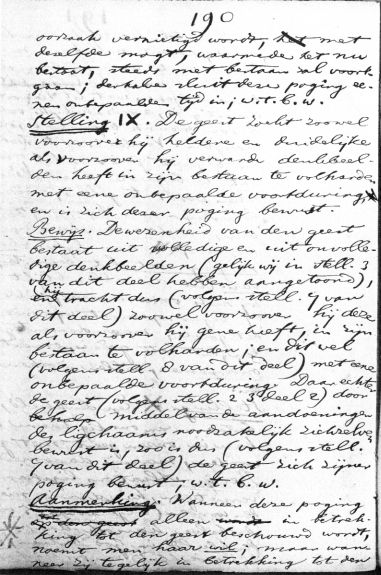 oorzaak vernietigd wordt, met dezelfde magt, waarmede het nu bestaat, steeds met bestaan zal voortgaan; derhalve sluit deze poging eenen onbepaalden tijd in; w.t.b.w. Stelling IX. De geest zoekt zoowel voorzoover hij heldere en duidelijke als voorzoover hij verwarde denkbeelden heeft in zijn bestaan te volharden met eene onbepaalde voortduring, en is zich dezer poging bewust. Bewijs. De wezenheid van den geest bestaat uit volledige en uit onvolledige denkbeelden (gelijk wij in stell. 3 van dit deel hebben aangetoond), en hij tracht dus (volgens stell. 7 van dit deel) zoowel voorzoover hij deze als voorzoover hij gene heeft, in zijn bestaan te volharden; en dit wel (volgens stell. 8 van dit deel) met eene onbepaalde voortduring. Daar echter de geest (volgens stell. 23 deel 2) door middel van de aandoeningen des ligchaams noodzakelijk zichzelven bewust is, zoo is dus (volgens stell. 7 van dit deel) de geest zich zijner poging bewust; w.t.b.w. Aanmerking. Wanneer deze poging alleen in betrekking tot den geest beschouwd wordt, noemt men haar wil; maar wanneer zij te gelijk in betrekking tot den >> aantal woorden: 179 |
