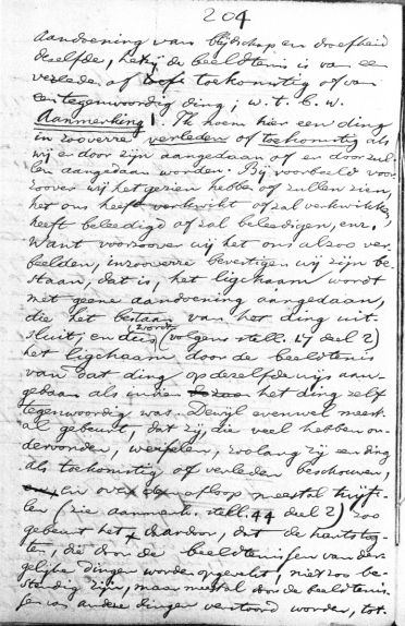 aandoening van blijdschap en droefheid dezelfde, hetzij de beeldtenis is van een verleden of toekomstig of van een tegenwoordig ding; w.t.b.w. Aanmerking 1. Ik noem hier een ding in zooverre verleden of toekomstig als wij er door zijn aangedaan of er door zullen aangedaan worden. Bijvoorbeeld voorzoover wij het gezien hebben of zullen zien, het ons heeft verkwikt of zal verkwikken, heeft beleedigd of zal beleedigen, enz. Want voorzoover wij het ons alzoo verbeelden, inzooverre bevestigen wij zijn bestaan, dat is, het ligchaam wordt met geene aandoening aangedaan, die het bestaan van het ding uitsluit en dus wordt (volgens stell. 17 deel 2) het ligchaam door de beeldtenis van dat ding op dezelfde wijs aangedaan als indien het ding zelf tegenwoordig was. Dewijl evenwel meestal gebeurt, dat zij, die veel hebben ondervonden, weifelen, zoolang zij een ding als toekomstig of verleden beschouwen, en over de afloop meestal twijfelen (zie aanmerk. stell. 44 deel 2) zoo gebeurt het daardoor, dat de hartstogten, die door de beeldtenissen van dergelijke dingen worden opgewekt, niet zoo bestendig zijn, maar meestal door de beeldtenissen van andere dingen verstoord worden, tot- >> aantal woorden: 186 |