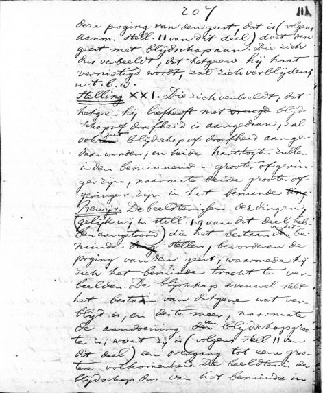 deze poging van den geest, dat is (volgens aanm. stell 11 van dit deel) doet den geest met blijdschap aan. Die zich dus verbeeldt, dat hetgeen hij haat vernietigd wordt, zal zich verblijden w.t.b.w. Stelling XXI. Die zich verbeeldt, dat hetgeen hij liefheeft met blijdschap of droefheid is aangedaan, zal ook met blijdschap of droefheid aangedaan worden; en beide hartstogten zullen in den beminnenden grooter of geringer zijn, naarmate beide grooter of geringer zijn in het beminde. Bewijs. De beeldtenissen der dingen, (gelijk wij in stell. 19 van dit deel hebben aangetoond) die het bestaan van het beminde stellen, bevorderen de poging van den geest, waarmede hij zich het beminde tracht te verbeelden. De blijdschap evenwel stelt het bestaan van datgene wat verblijd is, en des te meer, naarmate de aandoening van blijdschap grooter is; want zij is (volgens stell. 11 van dit deel) een overgang tot eene grootere volkomenheid. De beeldtenis der blijdschap dus van het beminde in >> aantal woorden: 160 |
