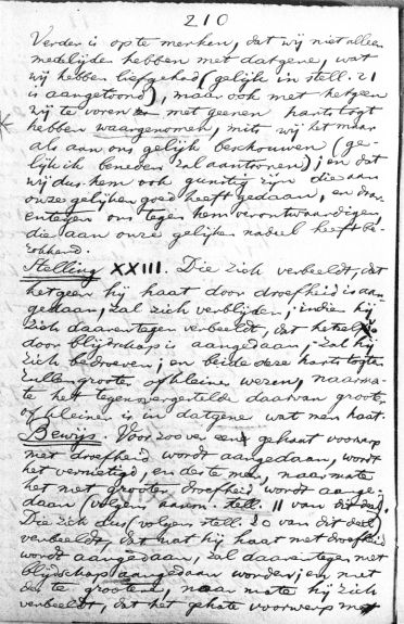 Verder is op te merken dat wij niet alleen medelijden hebben met datgene, wat wij hebben liefgehad (gelijk in stell. 21 is aangetoond), maar ook met hetgeen zij te voren met geenen hartstogt hebben waargenomen, mits wij het maar als aan ons gelijk beschouwen (gelijk ik beneden zal aantoonen); en dat wij dus hem ook gunstig zijn die aan onze gelijken goed heeft gedaan, en daarentegen ons tegen hem verontwaardigen, die aan onze gelijken nadeel heeft berokkend. Stelling XXIII. Die zich verbeeldt, dat hetgeen hij haat door droefheid is aangedaan, zal zich verblijden; indien hij zich daarentegen verbeeldt, dat hetzelfde door blijdschap is aangedaan; zal hij zich bedroeven; en beide deze hartstogten zullen grooter of kleiner wezen, naarmate het tegenovergestelde daarvan grooter of kleiner is in datgene wat men haat. Bewijs. Voor zoover een gehaat voorwerp met droefheid wordt aangedaan, wordt het vernietigd, en des te meer, naarmate het met grooter droefheid wordt aangedaan (volgens aanm. stell. 11 van dit deel). Die zich dus (volgens stell. 20 van dit deel) verbeeldt, dat wat hij haat met droefheid wordt aangedaan, zal daarentegen met blijdschap aangedaan worden; en met te grootere, naar mate hij zich verbeeldt, dat het gehate voorwerp met >> aantal woorden: 200 |