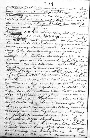 ontstaat, dat iemand over eenen anderen hooger denkt dan billijk is, overschatting genoemd; en daarentegen die welke daaruit ontstaat, dat men over eenen anderen lager denkt dan billijk is, minachting. Stelling XXVII. Daardoor, dat wij ons verbeelden dat iets aan ons gelijk en hetwelk wij met geenerlei hartstogt beschouwd hebben, door eenige aandoening wordt aangedaan, worden wij met eene dergelijke aandoening aangedaan. Bewijs. De beelden der dingen zijn de aandoeningen van het menschelijke ligchaam, waarvan de denkbeelden de uitwendige ligchamen als aan ons tegenwoordig voorstellen (volgens aanm. stell. 17 deel 2), dat is (volgens stell. 16 deel 2) wier denkbeelden de natuur van ons ligchaam en tevens de tegenwoordige natuur van het uitwendige ligchaam insluiten. Indien dus de natuur van het uitwendige ligchaam gelijk is aan de natuur van ons ligchaam, dan zal het denkbeeld van het uitwendige ligchaam, dat wij ons verbeelden, eene aandoening van ons ligchaam insluiten, die gelijk is aan de aandoening van het uitwendige ligchaam; en bij gevolg, indien wij ons verbeelden, dat iemand aan ons gelijk door eenige aandoening is aangedaan, dan zal deze verbeelding eene aandoening van >> aantal woorden: 184 |