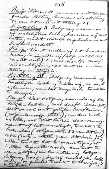 Bewijs. Dit wordt eveneens uit de voorgaande stelling bewezen als stelling 22 van dit deel uit stelling 21. Bijstelling II. Datgene, waarmede wij medelijden hebben, kunnen wij niet haten, omdat deszelfs ongeluk ons met droefheid aandoet. Bewijs. Want indien wij het konden haten, dan zouden wij (volgens stell. 23 van dit deel) ons over deszelfs droefheid verblijden, wat met de onderstelling in strijd is. Bijstelling III. Datgene, waarmede wij medelijden hebben, zullen wij, zooveel wij kunnen, van het ongeluk trachten te bevrijden. Bewijs. Wat datgene, waarmede wij medelijden hebben, met droefheid aandoet, doet ons ook met gelijke droefheid aan (volgens de vorige stell.); en dus zullen wij alles, wat het bestaan daarvan wegneemt of het vernietigt, trachten te bedenken (volgens stell. 13 van dit deel), dat is (volgens stell. 9 van dit deel) wij zullen trachten het te vernietigen, of zullen bepaald worden om het te vernietigen; en dus zullen wij datgene, waarmede wij medelijden hebben, van zijn ongeluk trachten te bevrijden; w.t.b.w. aantal woorden: 163 |