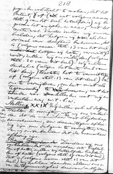 pogen dus volstrekt te maken, dat dit bestaat, of (wat volgens aanm. stell. 9 van dit deel hetzelfde is) wij begeeren het en zoeken ernaar; wat het eerste was. Verder indien wij ons verbeelden, dat hetgeen wij als de oorzaak van droefheid beschouwen, dat is (volgens aanm. stell. 13 van dit deel) hetgeen wij haten, vernietigd wordt, zullen wij ons verblijden (volgens stell. 20 van dit deel). Wij zullen derhalve (volgens het eerste deel van dit bewijs) trachten het te vernietigen of (volgens stell. 13 van dit deel) van ons te verwijderen, ons het niet als tegenwoordig te beschouwen; wat het tweede was. Alles dus wat wij ons verbeelden enz.; w.t.b.w. Stelling XXIX. Wij zullen ook al datgene trachten te verrigten, wat wij ons verbeelden dat de menschen (*) met blijdschap aanschouwen, en daarentegen afkeerig zijn om datgene te verrigten, waarvan wij ons verbeelden dat de menschen afkeerig zijn. Bewijs. Doordien wij ons verbeelden, dat de menschen iets liefhebben of haten, zullen wij hetzelfde liefhebben of haten (volgens stell. 27 van dit deel), dat is (volgens aanm. stell. 13 van dit deel) wij zullen daardoor alleen ons over de tegenwoordigheid daarvan verblijden >> (*) NB. Hier en in het vervolg bedoel ik menschen, jegens wie wij door geenen hartstogt zijn aangedaan. aantal woorden: 211 |