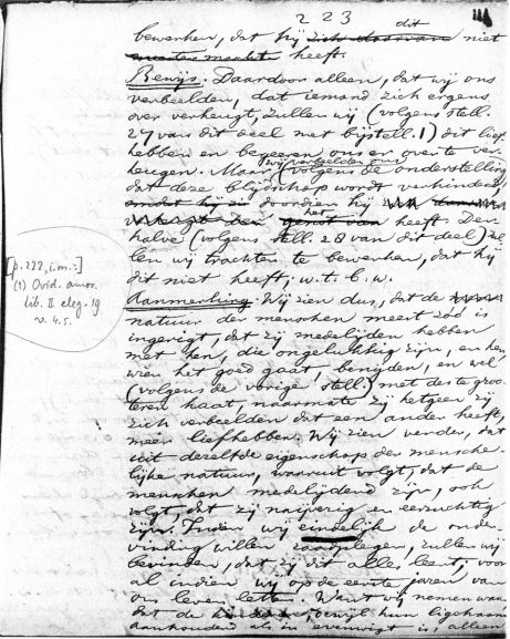 bewerken, dat hij dit niet heeft. Bewijs. Daardoor alleen, dat wij ons verbeelden, dat iemand zich ergens over verheugt, zullen wij (volgens stell. 27 van dit deel met bijstell. 1) dit liefhebben en begeeren ons erover te verheugen. Maar wij verbeelden ons volgens de onderstelling, dat deze blijdschap wordt verhinderd, doordien hij het heeft. Derhalve (volgens stell. 28 van dit deel) zullen wij trachten te bewerken, dat hij dit niet heeft; w.t.b.w. Aanmerking. Wij zien dus, dat de natuur der menschen meest zoo is ingerigt, dat zij medelijden hebben met hen, die ongelukkig zijn, en hen wien het goed gaat, benijden, en wel (volgens de vorige stell.) met des te grootere haat, naarmate zij hetgeen zij zich verbeelden dat een ander heeft, meer liefhebben. Wij zien verder, dat uit dezelfde eigenschap der menschelijke natuur, waaruit volgt, dat de menschen medelijdend zijn, ook volgt, dat zij naijverig en eerzuchtig zijn. Indien wij eindelijk de ondervinding willen raadplegen, zullen wij bevinden, dat zij dit alles leert; vooral indien wij op de eerste jaren van ons leven letten. Want wij nemen waar dat de kinderen, dewijl hun ligchaam aanhoudend als in evenwigt is, alleen >> aantal woorden: 192 |