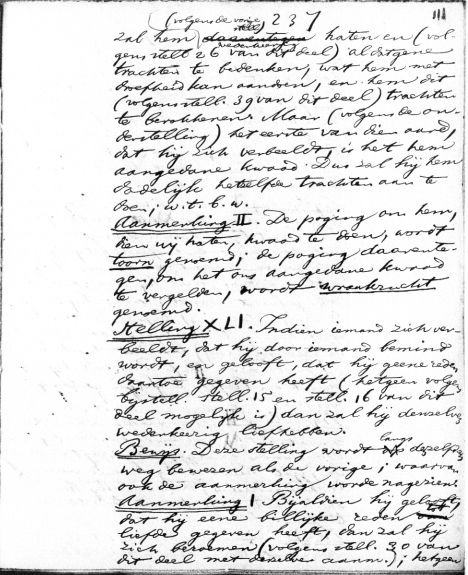 zal hem (volgens de vorige stell.) wederkeerig haten en (volgens stell. 26 van dit deel) al datgene trachten te bedenken, wat hem met droefheid kan aandoen, en hem dit (volgens stell. 39 van dit deel) trachten te berokkenen. Maar (volgens de onderstelling) het eerste van dien aard, dat hij zich verbeeldt, is het hem aangedane kwaad. Dus zal hij hem dadelijk hetzelfde trachten aan te doen; w.t.b.w. Aanmerking II. De poging om hem, dien wij haten, kwaad te doen, wordt toorn genoemd; de poging daarentegen, om het ons aangedane kwaad te vergelden, wordt wraakzucht genoemd. Stelling XLI. Indien iemand zich verbeeldt, dat hij door iemand bemind wordt, en gelooft, dat hij geene reden daartoe gegeven heeft (hetgeen volgens bijstell. stell. 15 en stell. 16 van dit deel mogelijk is) dan zal hij denzelven wederkeerig liefhebben. Bewijs. Deze stelling wordt langs dezelfden weg bewezen als de vorige; waarvan ook de aanmerking worde nagezien. Aanmerking I. Bijaldien hij gelooft, dat hij eene billijke reden tot liefde gegeven heeft, dan zal hij zich beroemen (volgens stell. 30 van dit deel met denzelven aanm.); hetgeen >> aantal woorden: 182 |