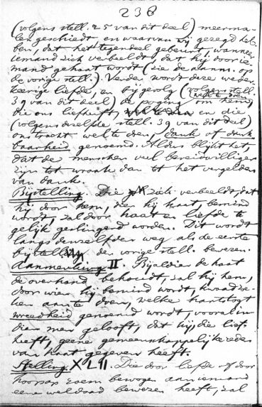 volgens stell. 25 van dit deel) meermalen geschiedt, en waarvan wij gezegd hebben, dat het tegendeel gebeurt, wanneer iemand zich verbeeldt, dat hij door iemand gehaat wordt (zie de aanm. op de vorige stell.). Verder wordt deze wederkeerige liefde, en bijgevolg (volgens stell. 39 van dit deel) de poging om hem wel te doen, die ons liefheeft, en die (volgens dezelfde stell. 39 van dit deel) ons tracht wel te doen, dank of dankbaarheid genoemd. Aldus blijkt het, dat de menschen veel bereidwilliger zijn tot wraak dan tot het vergelden van dank. Bijstelling. Die zich verbeeldt, dat hij door hem, dien hij haat, bemind wordt, zal door haat en liefde te gelijk geslingerd worden. Dit wordt langs denzelfden weg als de eerste bijstell. der vorige stell. bewezen. Aanmerking II. Bijaldien de haat de overhand behoudt, zal hij hem, door wien hij bemind wordt, kwaad zoeken aan te doen, welke hartstogt wreedheid genoemd wordt, vooral indien men gelooft, dat hij, die liefheeft, geene gemeenschappelijke reden van haat gegeven heeft. Stelling XLII. Die door liefde of door hoop op roem bewogen aan iemand eene weldaad bewezen heeft, zal >> aantal woorden: 187 |