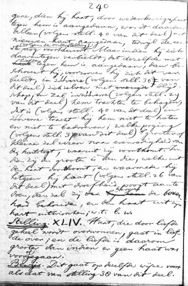 gene dien hij haat, door wederkeerigen haat tegen hem is aangedaan, wordt daardoor alleen (volgens stell.40 van dit deel) met nieuwen haat aangedaan, terwijl de eerste (volgens de onderstelling) nog voortduurt. Maar indien hij zich daarentegen verbeeldt, dat dezelfde met liefde tegen hem is aangedaan, dan beschouwt hij, voorzoover hij zich dit verbeeldt, in zóóverre (volgens stell. 30 van dit deel) zich zelven met blijdschap, en zal inzóóverre (volgens stell. 29 van dit deel) hem trachten te behagen, dat is (volgens stell. 40 van dit deel) in zóóverre tracht hij hem niet te haten en niet te bedroeven; welke poging (volgens stell. 3 van dit deel) grooter of kleiner zal wezen naar evenredigheid van den hartstogt, waaruit zij voortkomt. Indien zij dus grooter is dan die, welke uit den haat voorkomt, en waarmede hij hetgeen hij haat (volgens stell. 26 van dit deel) met droefheid poogt aan te doen, dan zal zij hierover de bovenhand behouden, en den haat uit zijn hart uitwisschen; w.t.b.w. Stelling XLIV. Haat, die door liefde geheel wordt overwonnen, gaat in liefde over; en de liefde is daarom grooter dan indien er geen haat was voorafgegaan. Bewijs. Dit gaat op dezelfde wijze voort als dat van stelling 38 van dit deel. aantal woorden: 205 |