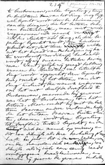 te beschouwen, welke bepaling, terwijl de beeldtenis van het ding nog blijft, wel beperkt wordt door de herinnering aan die dingen, die het bestaan daarvan buitensluiten, maar niet wordt weggenomen. De mensch verblijdt zich dus slechts zoo lang, als deze bepaling beperkt wordt; en hierdoor gebeurt het, dat deze blijdschap welke uit het kwaad van hetgeen wij haten voortkomt, zoo dikwijls herhaald wordt, als wij ons aan hetzelve herinneren. Want, gelijk wij gezegd hebben, wanneer de beeldtenis van hetzelfde ding wordt opgewekt, dan bepaalt deze, omdat zij het bestaan van dat ding insluit, den mensch wederom om het met dezelfde droefheid te beschouwen, waarmede hij gewoon was het te beschouwen, toen het bestond. Maar omdat hij met de beeldtenis daarvan andere verbonden heeft, die het bestaan daarvan buitensluiten, daarom wordt deze bepaling tot droefheid terstond beperkt, en verblijdt zich de mensch opnieuw, en dit zoo dikwijls als deze herhaling plaatsheeft. En juist dit is de reden waarom de menschen zich verblijden, zoo dikwijls als zij zich aan eenig reeds voorbijgegaan kwaad herinneren, en waarom zij gaarne de gevaren verhalen, >> aantal woorden: 180 |