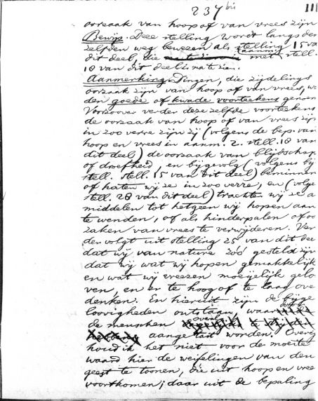 oorzaak van hoop of van vrees zijn. Bewijs. Deze stelling wordt langs dezelfden weg bewezen als stelling 15 van dit deel, die met aanm. stell. 18 van dit deel is na te zien. Aanmerking. Dingen, die zijdelings oorzaak zijn van hoop of van vrees, worden goede of kwade voorteekens genoemd. Voorzoover verder deze zelfde voorteekens de oorzaak van hoop of van vrees zijn, zoo verre zijn zij (volgens de bep. van hoop en vrees in aanm. 2. stell. 18 van dit deel) de oorzaak van blijdschap of droefheid, en bijgevolg (volgens bijstell. stell. 15 van dit deel) beminnen of haten wij ze in zoo verre, en (volgens stell. 28 van dit deel) trachten wij ze als middelen tot hetgeen wij hopen aan te wenden, of als hinderpalen of oorzaken van vrees te verwijderen. Verder volgt uit stelling 25 van dit deel dat wij van nature zóó gesteld zijn dat wij wat wij hopen gemakkelijk en wat wij vreezen moeijelijk gelooven, en er te hoog of te laag over denken. En hieruit zijn de bijgeloovigheden ontstaan, waardoor de menschen overal aangetast worden. Overigens houd ik het niet voor de moeite waard hier de weifelingen van den geest te toonen, die uit hoop en vrees voortkomen; daar uit de bepaling >> aantal woorden: 211 |
