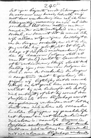 dat zijne begeerte wordt bedwongen door de vrees voor een kwaad, hetwelk mij niet kan weerhouden, dan zal ik hem kleingeestig noemen, en zóó zal ieder oordeelen. Uit deze natuur van den mensch en de onstandvastigheid van zijn oordeel, en daaruit dat de mensch dikwijls alleen volgens zijnen hartstogt over de dingen oordeelt, en dat de dingen, welke hij gelooft, dat tot blijdschap of droefheid medewerken, en die hij daarom (volgens stell. 28 van dit deel) zoekt te bevorderen of te verhinderen, dikwijls slechts denkbeeldig zijn, om nu van hetgeen in deel 2. over de onzekerheid der dingen is aangetoond niet te spreken, begrijpen wij ligtelijk, dat de mensch dikwijls in het geval kan wezen, zoowel dat hij zich bedroeft als dat hij zich verblijdt, of dat hij zoowel door droefheid als door blijdschap wordt aangedaan, verbonden met het denkbeeld van zichzelven als oorzaak. En aldus begrijpen wij gemakkelijk wat berouw en wat tevredenheid met zichzelven is: namelijk berouw is droefheid verbonden met het denkbeeld van zichzelven; en tevredenheid met zichzelven is blijdschap verbonden >> aantal woorden: 175 |