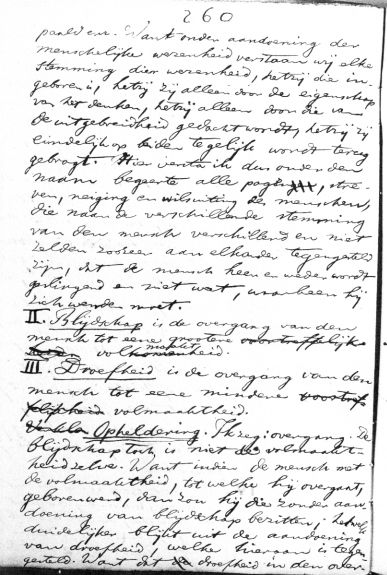 paald enz. Want onder aandoening der menschelijke wezenheid verstaan wij elke stemming dier wezenheid, hetzij die ingeboren is, hetzij zij alleen door de eigenschap van het denken, hetzij alleen door die van de uitgebreidheid gedacht wordt, hetzij zij eindelijk op beiden te gelijk wordt terug gebragt. Hier versta ik dan onder den naam begeerte alle pogen, streven, neiging en wilsuiting des menschen, die naar de verschillende stemming van den mensch verschillend en niet zelden zoozeer aan elkander tegengesteld zijn, dat de mensch heen en weder wordt geslingerd en niet weet, waarheen hij zich wenden moet. II. Blijdschap is de overgang van den mensch tot eene grootere volmaaktheid. III. Droefheid is de overgang van den mensch tot eene mindere volmaaktheid. Opheldering. Ik zeg: overgang. De blijdschap toch is niet de volmaaktheid zelve. Want indien de mensch met de volmaaktheid, tot welke hij overgaat, geboren werd, dan zou hij die zonder aandoening van blijdschap bezitten; hetwelk duidelijker blijkt uit de aandoening van droefheid, welke hieraan is tegengesteld. Want dat droefheid in den over- >> aantal woorden: 173 |