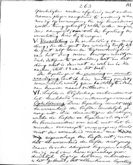 spronkelijke worden afgeleid, met andere namen plegen aangeduid te worden, wanneer zij op voorwerpen, die wij bewonderen, worden teruggebragt; welke reden mij even zeer aanspoort, om ook de bepaling der verachting hier bij te voegen. V. Verachting is de verbeelding van eenig ding, die den geest zoo weinig treft, dat de geest zelf door de tegenwoordigheid van het ding meer bewogen wordt, om zich datgene te verbeelden, wat in het ding niet is dan wat er wel in is. Zie aanm. stell. 52 van dit deel. De bepalingen der vereering en verontwaardiging laat ik hier rusten, omdat zoover als ik weet, geene hartstogten daaraan hunnen naam ontleenen. VI. Liefde is blijdschap verbonden met het denkbeeld van uitwendige oorzaak. Opheldering. Deze bepaling drukt de wezenheid der liefde duidelijk genoeg uit. Die daarentegen der schrijvers, welke de liefde bepalen als den wil des beminnenden om zich met het beminde voorwerp te vereenigen, drukt niet de wezenheid maar eene eigenschap der liefde uit; en omdat de wezenheid der liefde niet genoegzaam door de schrijvers begrepen was, konden zij ook van hare eigenschap geen duidelijk begrip hebben, en hierdoor is het gebeurd, dat allen hunne bepaling >> aantal woorden: 193 |