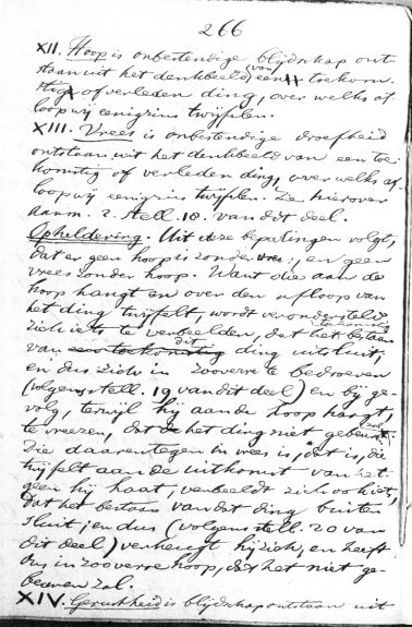 XII. Hoop is onbestendige blijdschap ontstaan uit het denkbeeld van een toekomstig of verleden ding, over welks afloop wij enigzins twijfelen. XIII. Vrees is onbestendige droefheid ontstaan uit het denkbeeld van een toekomstig of verleden ding, over welks afloop wij enigzins twijfelen. Zie hierover aanm. 2 stell. 18. van dit deel. Opheldering. Uit deze bepalingen volgt, dat er geen hoop is zonder vrees, en geen vrees zonder hoop. Want die aan de hoop hangt en over den afloop van het ding twijfelt, wordt verondersteld zich iets te verbeelden, dat het toekomstig bestaan van dit ding uitsluit, en dus zich in zooverre te bedroeven (volgens stell. 19 van dit deel) en bij gevolg, terwijl hij aan de hoop hangt, te vreezen, dat het ding niet gebeurt. Die daarentegen in vrees is, dat is, die twijfelt aan de uitkomst van hetgeen hij haat, verbeeldt zich ook iets, dat het bestaan van dat ding buiten sluit; en dus (volgens stell. 20 van dit deel) verheugt hij zich, en heeft dus in zooverre hoop, dat het niet gebeuren zal. XIV. Gerustheid is blijdschap ontstaan uit >> aantal woorden: 183 |