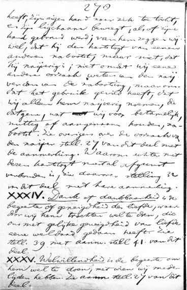 heeft, zijn eigen haat naar zich toe trekt, en zijn ligchaam beweegt, als of zijne hand gebrand werd; van hem zeggen wij wel dat hij den hartstogt van eenen anderen nabootst, maar niet, dat hij naijverig is; niet omdat wij eene andere oorzaak weten van den naijver dan van de nabootsing, maar omdat het gebruik gewild heeft, dat wij alleen hem naijverig noemen, die datgene, wat wij voor betamelijk, nuttig of aangenaam houden, nabootst. Zie overigens over de oorzaak van den naijver stell. 27 van dit deel met de aanmerking. Waarom echter met deze hartstogt meestal afgunst verbonden is, zie daarover stelling 32 van dit deel met hare aanmerking. XXXIV. Dank of dankbaarheid is de begeerte of geneigdheid der liefde, waardoor wij hem trachten wel te doen, die ons met gelijke geneigdheid van liefde eene weldaad gedaan heeft. Zie stell. 39 met aanm. stell. 41 van dit deel. XXXV. Welwillendheid is de begeerte om hem wel te doen, met wien wij medelijden hebben. Zie aanm. stell. 27 van dit deel. aantal woorden: 170 |