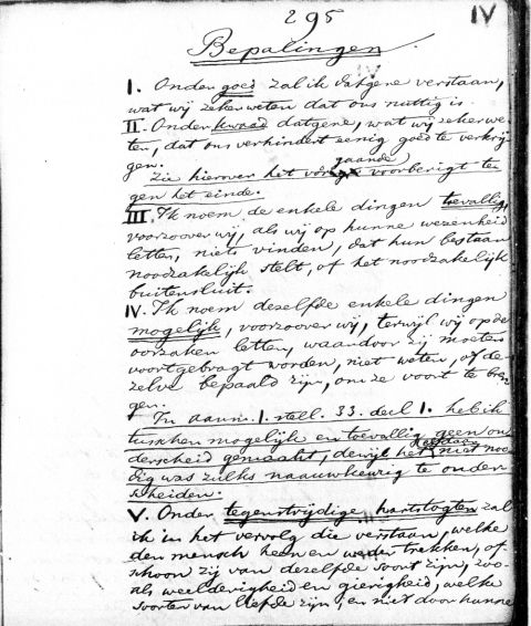 Bepalingen I. Onder goed zal ik datgene verstaan, wat wij zeker weten dat ons nuttig is. II. Onder kwaad datgene, wat wij zeker weten, dat ons verhindert eenig goed te verkrijgen. Zie hierover het voorgaande voorberigt tegen het einde. III. Ik noem de enkele dingen toevallig, voorzoover wij, als wij op hunne wezenheid letten, niets vinden, dat hun bestaan noodzakelijk stelt, of het noodzakelijk buitensluit. IV. Ik noem dezelfde enkele dingen mogelijk, voorzoover wij, terwijl wij op de oorzaken letten, waardoor zij moeten voortgebragt worden, niet weten, of dezelve bepaald zijn, om ze voort te brengen. In aanm. I stell. 33 deel I. heb ik tusschen mogelijk en toevallig geen onderscheid gemaakt, dewijl het aldaar niet noodig was zulks naauwkeurig te onderscheiden. V. Onder tegenstrijdige hartstogten zal ik in het vervolg die verstaan, welke den mensch heen en weder trekken, ofschoon zij van denzelfde soort zijn, zooals weelderigheid en gierigheid, welke soorten van liefde zijn; en niet door hunne >> aantal woorden: 162 |