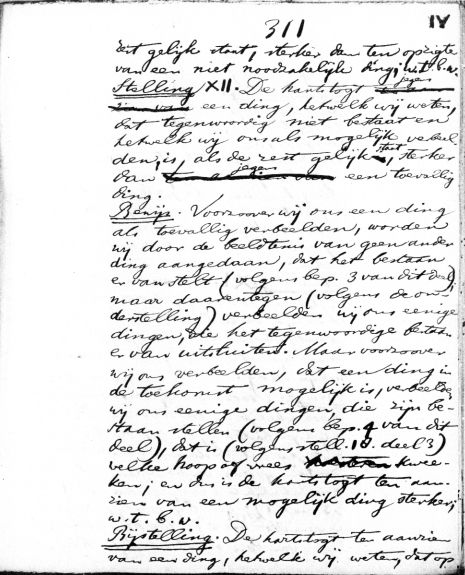 rest gelijk staat, sterker dan ten opzigte van een niet noodzakelijk ding; w.t.b.w. Stelling XII. De hartstogt jegens een ding, hetwelk wij weten, dat tegenwoordig niet bestaat en hetwelk wij ons als mogelijk verbeelden, is, als de rest gelijk staat, sterker dan jegens een toevallig ding. Bewijs. Voorzoover wij ons een ding als toevallig verbeelden, worden wij door de beeldtenis van geen ander ding aangedaan, dat het bestaan er van stelt (volgens bep. 3 van dit deel), maar daarentegen (volgens de onderstelling) verbeelden wij ons eenige dingen, die het tegenwoordige bestaan er van uitsluiten. Maar voorzoover wij ons verbeelden, dat een ding in de toekomst mogelijk is, verbeelden wij ons eenige dingen, die zijn bestaan stellen (volgens bep. 4 van dit deel), dat is (volgens stell. 18 deel 3) welke hoop of vrees kweeken; en dus is de hartstogt ten aanzien van een mogelijk ding sterker; w.t.b.w. Bijstelling. De hartstogt ten aanzien van een ding, hetwelk wij weten, dat op >> aantal woorden: 161 |