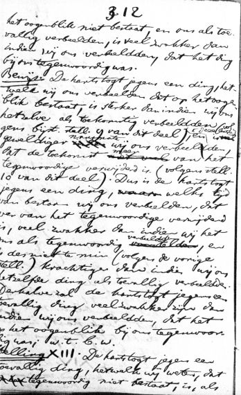het oogenblik niet bestaat, en ons als toevallig verbeelden, is veel zwakker dan indien wij ons verbeeldden, dat het ding bij ons tegenwoordig was. Bewijs. De hartstogt jegens een ding, hetwelk wij ons verbeelden dat op het oogenblik bestaat, is sterker dan indien wij ons hetzelve als toekomstig verbeeldden (volgens bijst. stell. 9 van dit deel), en [deze laatste] is geweldiger naarmate wij ons verbeelden, dat de toekomst meer van het tegenwoordige verwijderd is (volgens stell. 10 van dit deel). Dus is de hartstogt jegens een ding, welks tijd van bestaan wij ons verbeelden, dat ver van het tegenwoordige verwijderd is, veel zwakker dan indien wij het ons als tegenwoordig verbeeldden, en is des niet te min (volgens de vorige stell.) krachtiger dan indien wij ons hetzelfde ding als toevallig verbeeldden. Derhalve zal de hartstogt jegens een toevallig ding veel zwakker zijn dan indien wij ons verbeeldden, dat het op het oogenblik bij ons tegenwoordig was; w.t.b.w. Stelling XIII. De hartstogt jegens een toevallig ding, hetwelk wij weten, dat tegenwoordig niet bestaat, is, als >> aantal woorden: 175 |