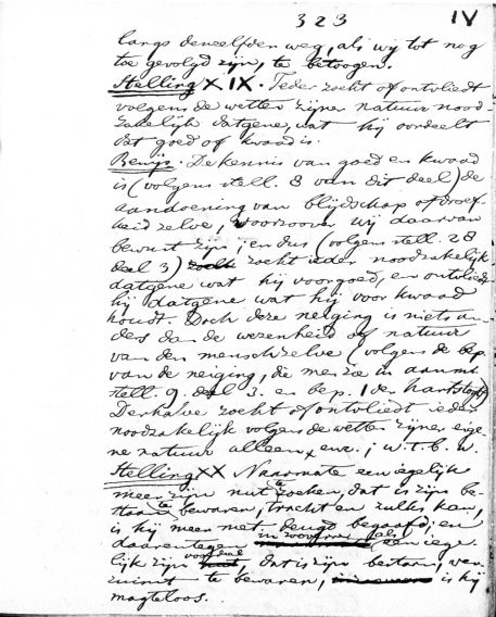 langs denzelfden weg, als wij tot nog toe gevolgd zijn, te betoogen. Stelling XIX. Ieder zoekt of ontvliedt volgens de wetten zijner natuur noodzakelijk datgene, wat hij oordeelt dat goed of kwaad is. Bewijs. De kennis van goed en kwaad is (volgens stell.8 van dit deel) de aandoening van blijdschap of droefheid zelve, voorzoover wij daarvan bewust zijn; en dus (volgens stell. 28 deel 3) zoekt ieder noodzakelijk datgene wat hij voor goed, en ontvliedt hij datgene wat hij voor kwaad houdt. Doch deze neiging is niets anders dan de wezenheid of natuur van den mensch zelve (volgend de bep. van de neiging, die men zie in aanm. stell. 9. deel 3. en bep. 1 der hartstogtt). Derhalve zoekt of ontvliedt ieder noodzakelijk volgens de wetten zijner eigene natuur alleen, enz.; w.t.b.w. Stelling XX Naarmate een iegelijk meer zijn nut te zoeken, dat is zijn bestaan te bewaren, tracht en zulks kan, is hij meer met deugd begaafd; en daarentegen in zooverre als een iegelijk zijn voordeel, dat is zijn bestaan, verzuimt te bewaren, is hij magteloos. aantal woorden: 177 |