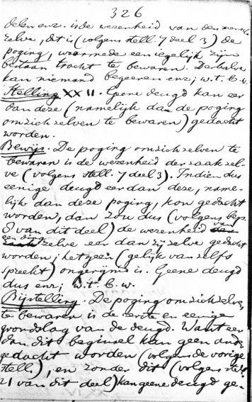 handelen enz. is de wezenheid van den mensch zelve, dat is (volgens stell. 7 deel 3) de poging, waarmede een iegelijk zijn bestaan tracht te bewaren. Derhalve kan niemand begeeren enz.; w.t.b.w. Stelling XXII. Geene deugd kan eer dan deze (namelijk dan de poging om zichzelven te bewaren) gedacht worden. Bewijs. De poging om zichzelven te bewaren is de wezenheid der zaak zelve (volgens stell. 7 deel 3). Indien dus eenige deugd eer dan deze, namelijk dan deze poging, kon gedacht worden, dan zou dus (volgens bep. 8 van dit deel) de wezenheid van een ding zelve eer dan zij zelve gedacht worden; hetgeen (gelijk van zelfs spreekt) ongerijmd is. Geene deugd dus enz.; w.t.b.w. Bijstelling. De poging om zichzelven te bewaren is de eerste en enige grondslag van de deugd. Want eer dan dit beginsel kan geen ander gedacht worden (volgens de vorige stell.), en zonder dit (volgens stell. 21 van dit deel) kan geene deugd ge- >> aantal woorden: 159 |